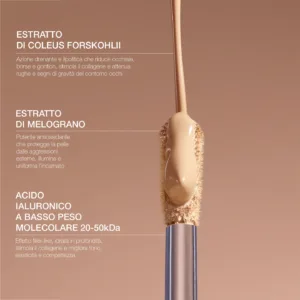 Azione drenante e lipolitica più potente della caffeina: riduce visibilmente occhiaie bluastre e scure, gonfiori e borse di grasso. Sostiene la produzione naturale di collagene e riduce la presenza di rughe, zampe di gallina e segni di gravità. Protegge ed uniforma la fragile zona del contorno occhi. - ESTRATTO DI MELOGRANO