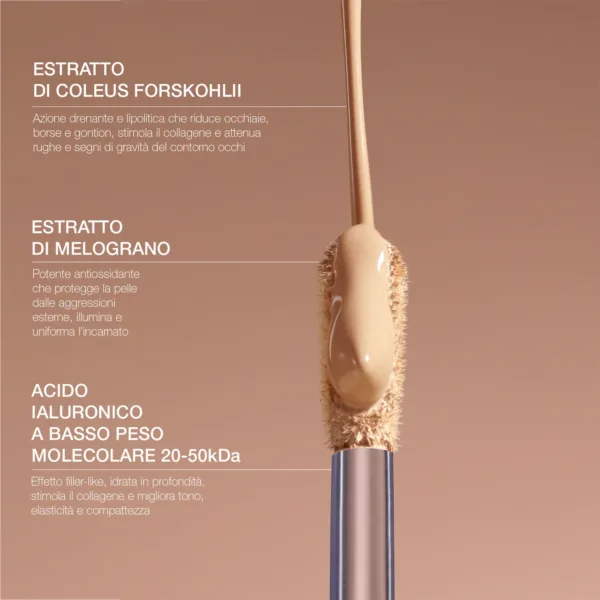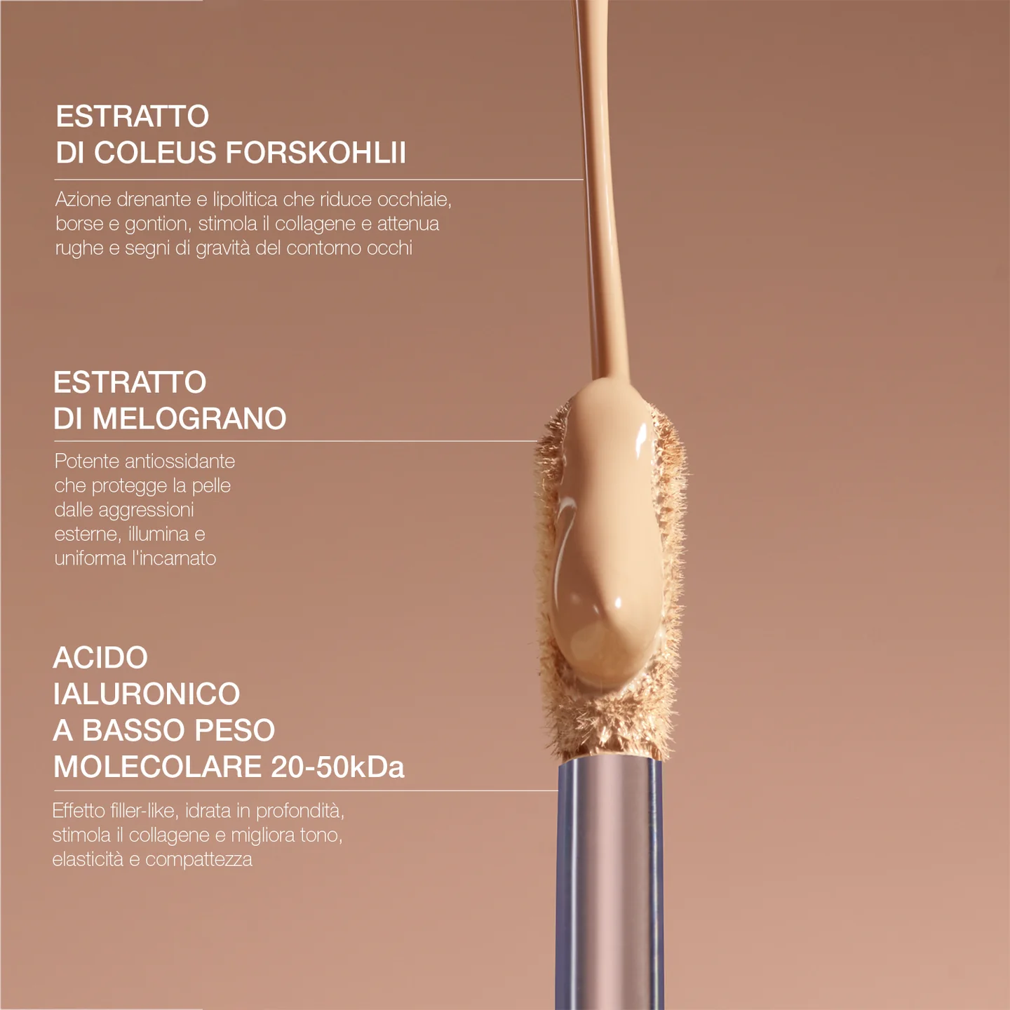 Minimizza occhiaie, piccole rughe e imperfezioni – Aspetto levigato e radioso – Pelle elastica e sana – Effetto soft-focus intensificato – Ultralight weight – Long lasting 12h – Coprenza medio-alta modulabile – Azione filtro immediata
