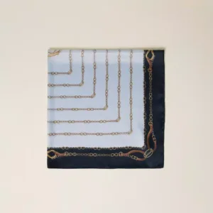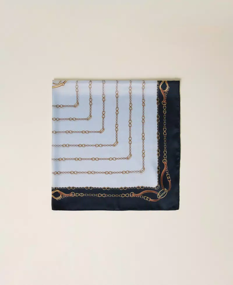 Foulard in viscosa leggera dall’aspetto serico con stampa logo a catena e logo lettering a contrasto.