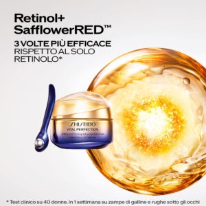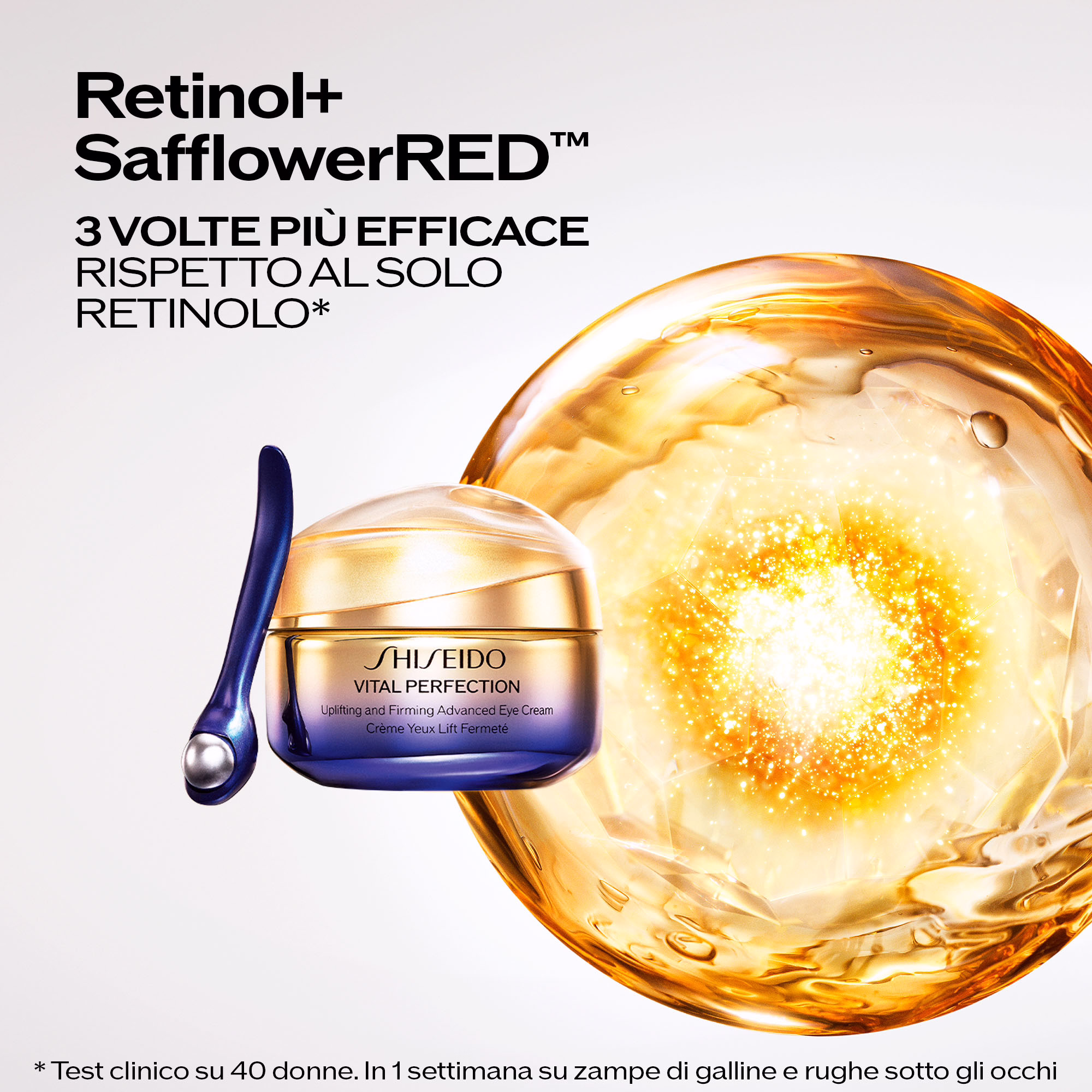 Shiseido ha potenziato la formula del contorno occhi bestseller Vital Perfection con retinolo per contrastare efficacemente rilassamento cutaneo, occhiaie e rughe profonde in 1 sola settimana(1) e rivelare uno sguardo liftato, rassodato e più luminoso. In particolare, questa nuova formula amplifica il potere del Retinolo combinandolo con il brevetto SafflowerRED™; test clinici dimostrano che questa combinazione è 3 volte più efficace sulle rughe del contorno occhi rispetto al solo retinolo(2). Nuovo esclusivo strumento da massaggio 3 in 1, amplifica l’effetto della crema occhi contrastando i segni dell’età con risultati clinicamente provati.